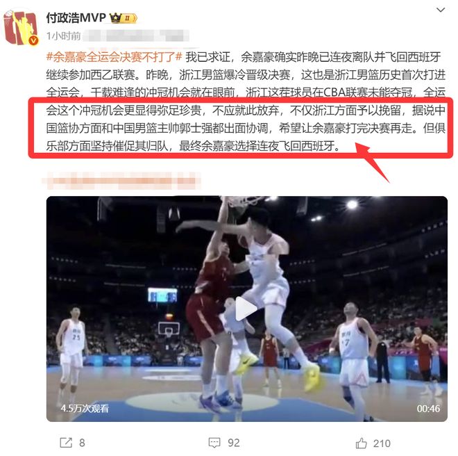 而且接下来,名记付政浩爆料,余嘉豪这次是主动放弃了接下来的比赛返回西班牙的,浙江队不是不想让他留下,甚至进行了一个全方位的挽留。不光是浙江队方面在挽留余嘉豪,篮协和郭士强都出面协调,希望余嘉豪把决赛打完了再走,毕竟冲冠的机会千载难逢。