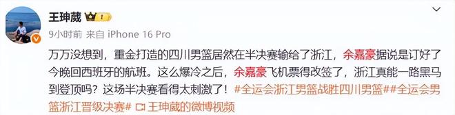 浙江与四川的半决赛是昨天下午四点钟开打了。据媒体人透露,开打之前余嘉豪已订好了当晚回西班牙的机票。在余嘉豪和球队看来,两队实力悬殊,大概率打不过四川队,所以球队也同意余嘉豪打完比赛当晚就返回西班牙,放弃打第三名铜牌战。但没想到浙江队最终爆冷击败四川,那么说,余嘉豪会改票留下来打今晚的决赛吗?