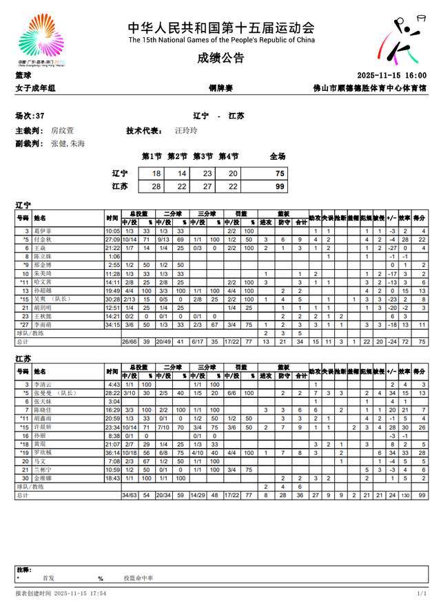 辽宁队付金秋22分9篮板4助攻,李雨萌11分3篮板3助攻,孙超越13分2篮板。江苏队罗欣棫28分8篮板3助攻,许晨妍26分9篮板,张曼曼13分2篮板7助攻。
