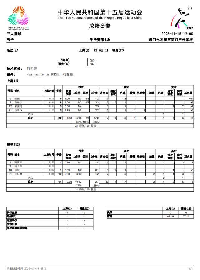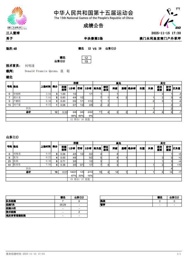 11月16日,十五运三人男篮项目进入收官日。经过较量,福建队无缘决赛,以14-22不敌上海队,王哲林空砍10分4篮板。在另一场半决赛中,山东队多点开花,陈培东5分5篮板,以19-12淘汰了黑马湖北队,打进决赛。至此,上海队将与山东队争夺金牌,决赛时间也定了。