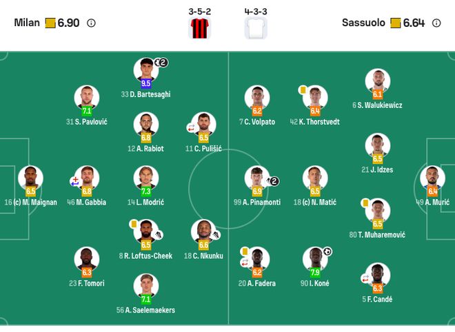 下半场开始2分钟,19岁的巴特萨基梅开二度。之后,普利西奇和拉比奥特的进球都因为越位被取消。第77分钟,劳里恩特扳平比分。最终,AC米兰主场2-2战平萨索洛,联赛3连胜就此终结,15轮不败的情况下先赛领先那不勒斯1分,继续领跑积分榜。